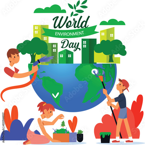 World Environment Day with People are gardening and cleaning the earth. save the planet flat vector illustration