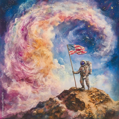 Worms-eye view of a colossal astronaut planting a vibrant flag on a distant planet