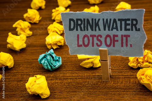 Writing note showing Drink Water. Lots Of It. Business photo showcasing drinking liquids to keep our body in great status Cardboard with letters wooden floor fuzzy yellow lumps green hunch