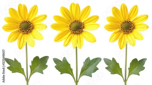 Yellow Flower Trio with Green Leaves on White Background
