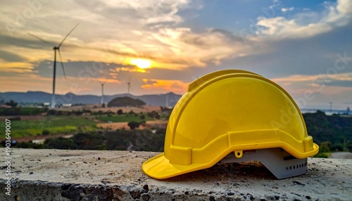 Yellow Hard Hat on Construction Site with Wind Turbines at Sunset.