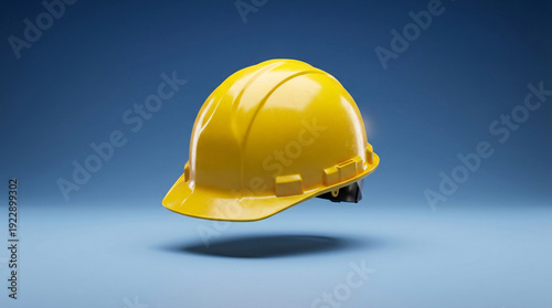 Yellow plastic construction hard hat with a brim, safety equipment for workers on a blue background