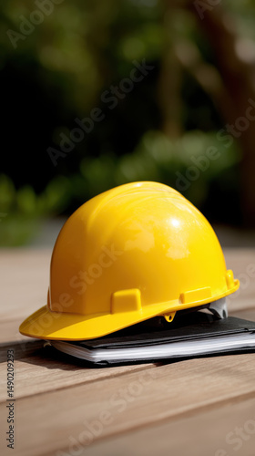 Yellow safety helmet resting black notebook wooden surface outdoors, with blurred green foliage
