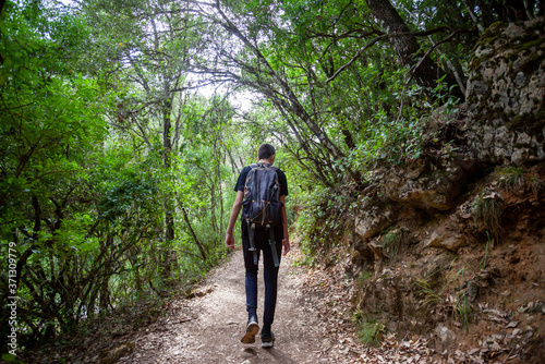 Young adventurer on his back with backpack walking while traveling on offroad nature tourism in the middle of the forest in the Cazorla Natural Park, in Spain. Selective focus.