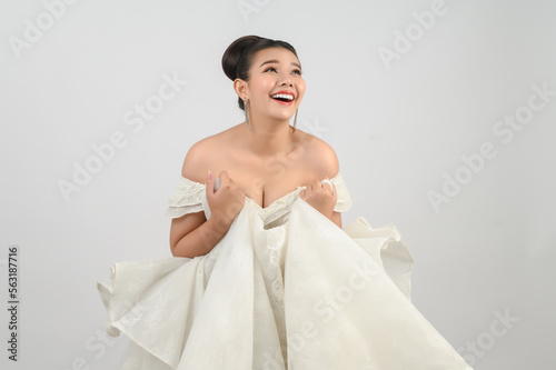 Young asian beautiful bride pose with excited feel on white background