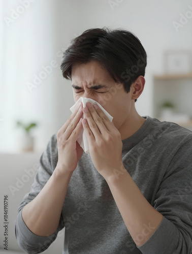 Young Asian Man Sneezing at Home — Blowing Nose with Tissue, Cold & Allergy