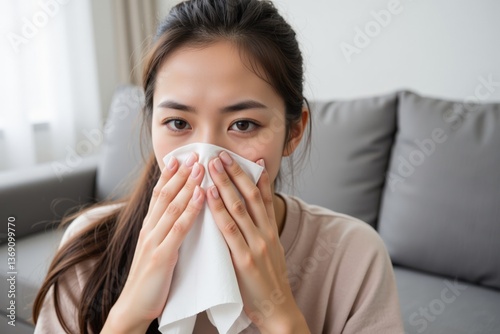 Young Asian Woman Experiencing Allergies or Cold Symptoms While Sitting on a Couch at Home, Holding a Tissue Close to Her Face with Concerned Expression