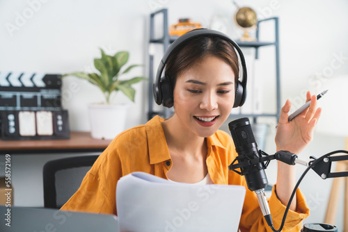 Young Asian woman use microphones wear headphones with laptop record podcast interview for radio. Content creator concept.