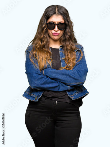 Young beautiful woman wearing sunglasses skeptic and nervous, disapproving expression on face with crossed arms. Negative person.