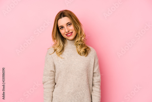 Young blonde cute woman wearing a sweater isolated happy, smiling and cheerful.