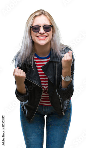 Young blonde woman wearing fashion jacket and sunglasses over isolated background very happy and excited doing winner gesture with arms raised, smiling and screaming for success. Celebration concept.