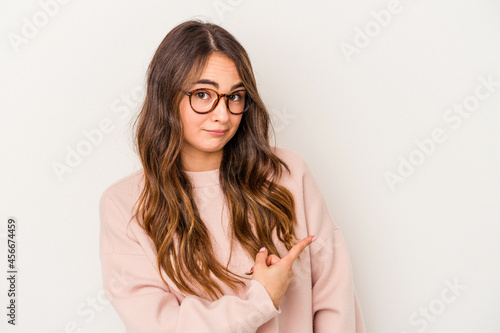 Young caucasian woman isolated on white background smiling and pointing aside, showing something at blank space.