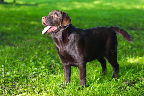 young chocolate labrador retriever standing on green grass