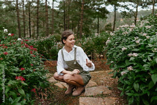 Young female gardener smiling among blooming flowers in a lush garden, wearing a white shirt and green overalls, showcasing a vibrant and seasonal atmosphere