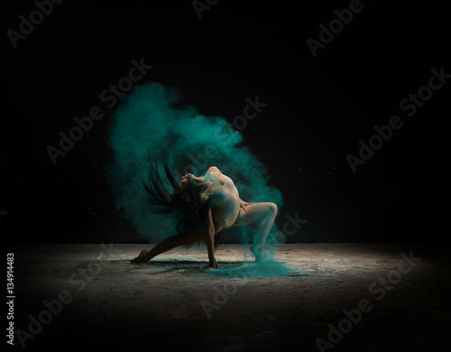 Young girl posing in cloud of bright green dust