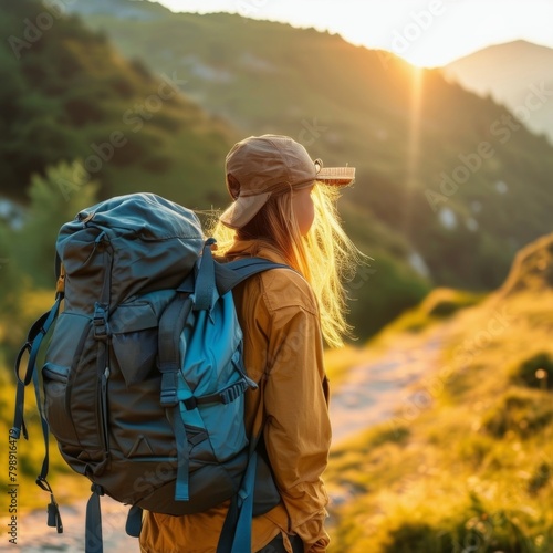 young girl traveller with backpack travelling in mountains at dawn, beginning of journey, ai generated