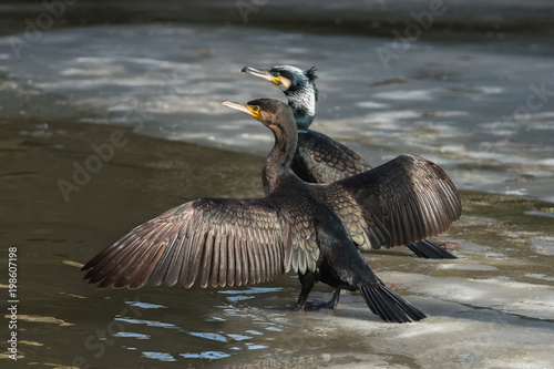 Young great cormorant (Phalacrocorax carbo) next to an adult drying wings, The Netherlands