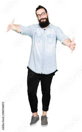 Young hipster man with long hair and beard wearing glasses looking at the camera smiling with open arms for hug. Cheerful expression embracing happiness.