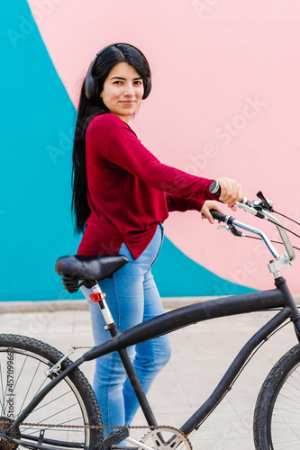 young hispanic latina woman riding with her bicycle smiling looking at camera with wireless headset. colorful background, pink and blue. vertical photo