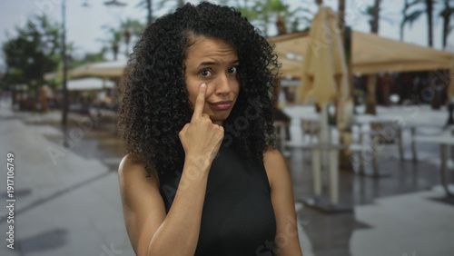 Young hispanic latino woman touches eye with finger on sunlit outdoor terrace; irritation exhaustion.
