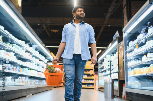 Young indian man walking through supermarket aisles holding shopping basket