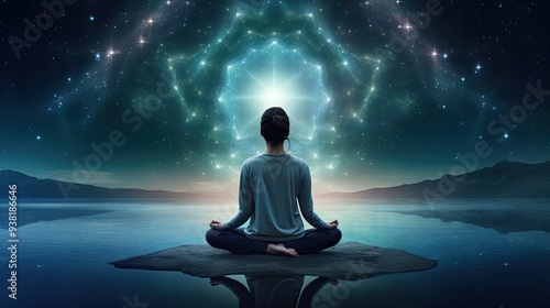 young man or woman meditating absorbed in their practice reflecting a state of deep meditation and mindfulness, celestial bodies, galaxies, and a mesmerizing night sky in background