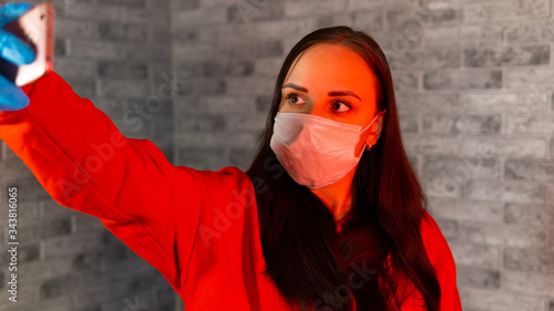 Young woman in medical mask and gloves taking selfie on smartphone, standing on gray brick background. Portrait of female spending time weekend at home and photographing of herself on mobile phone.