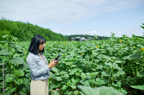 Young woman learning how to pilot her drone in, female using, piloting