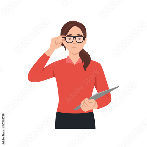 Young woman touching her glasses and looking ahead. Flat vector illustration isolated on white background