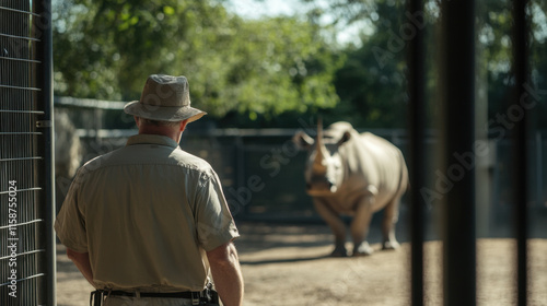 zookeeper observes large rhinoceros in secure enclosure, ensuring its safety and well being. scene captures bond between wildlife and caretakers