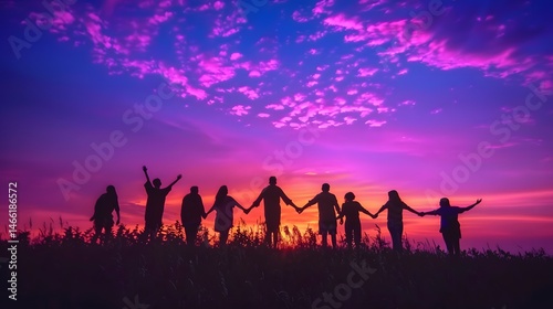 "Silhouette of Group of People Holding Hands Against Vibrant Sunset Sky" concept horizon celebration dusk connection bond