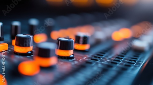 A close-up view of a music mixing console, highlighting the dials and glowing buttons, offering a glimpse into the technical artistry behind sound production in modern music.